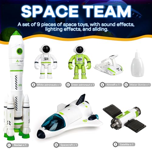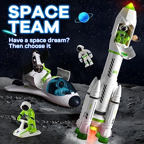 - Embark on an epic space toys mission! Experience the excitement of liftoff with our spaceship rockets toy, complete with authentic sound effects and mesmerizing light displays. The wheels on the bottom allow kids to simulate ground takeoffs, transforming each play session into an exciting cosmic journey. Get ready for an out-of-this-world adventure with our space shuttle toy!